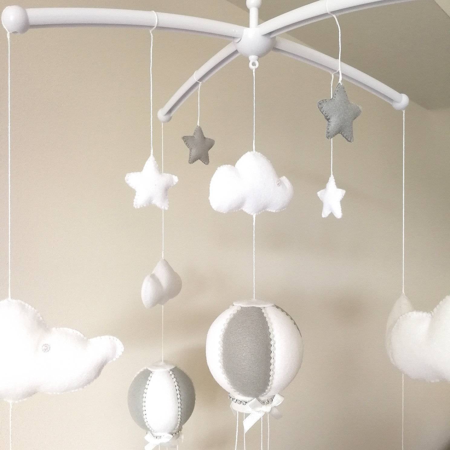 This is the one that started it all, my signature Balloon Mobile, crafted with love and filled with peaceful movement and timeless charm. Featuring three handmade and exclusive to Happy Little Cloud hot air balloons surrounded by soft clouds and tiny stars, this piece has become a nursery classic.
