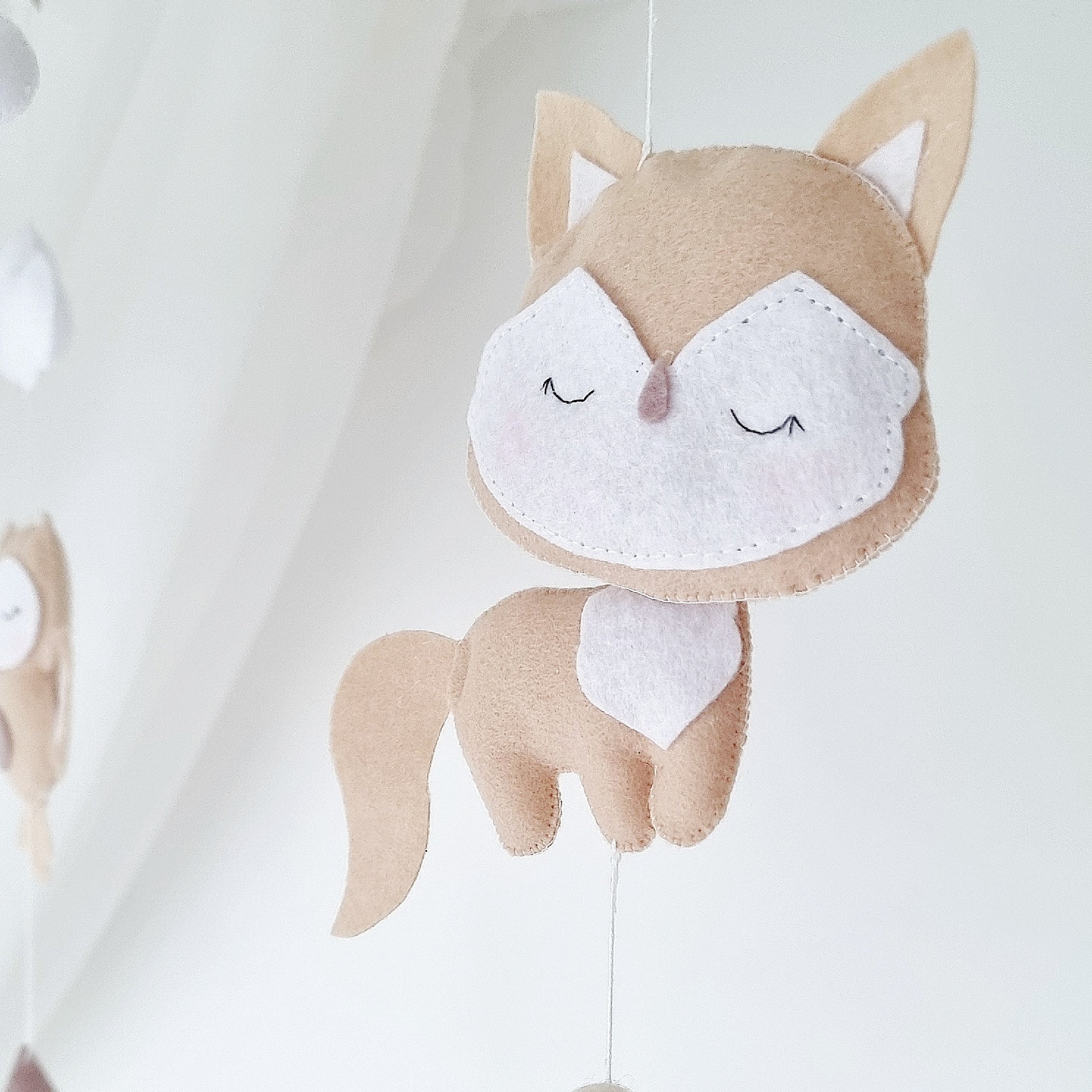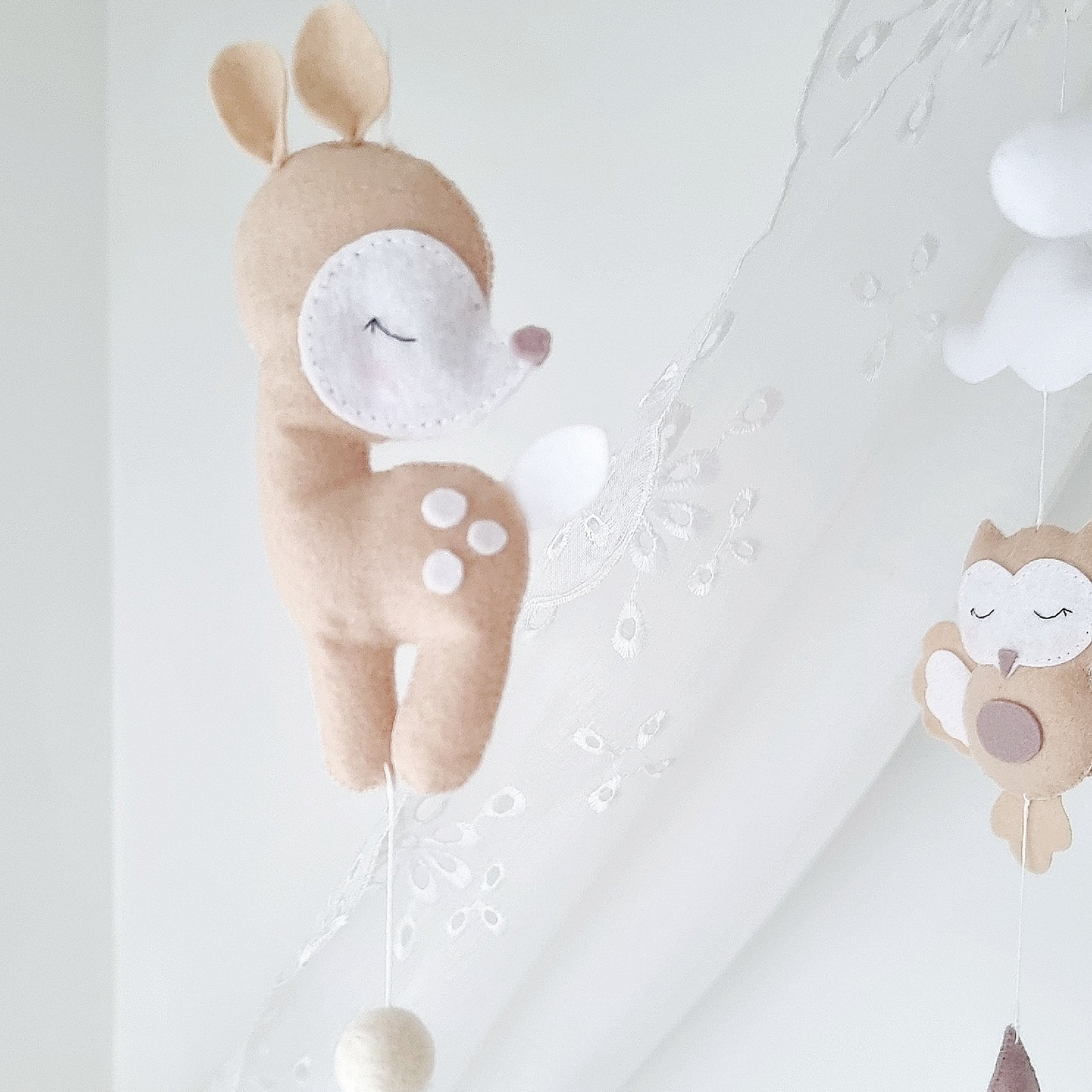 Sleepy little woodland animals and a sky full of stars. This mobile was made for magical mornings and soft bedtime stories. Each piece is lovingly stitched in warm, earthy tones, cosy like a forest hug with little hearts and clouds floating above like a lullaby.