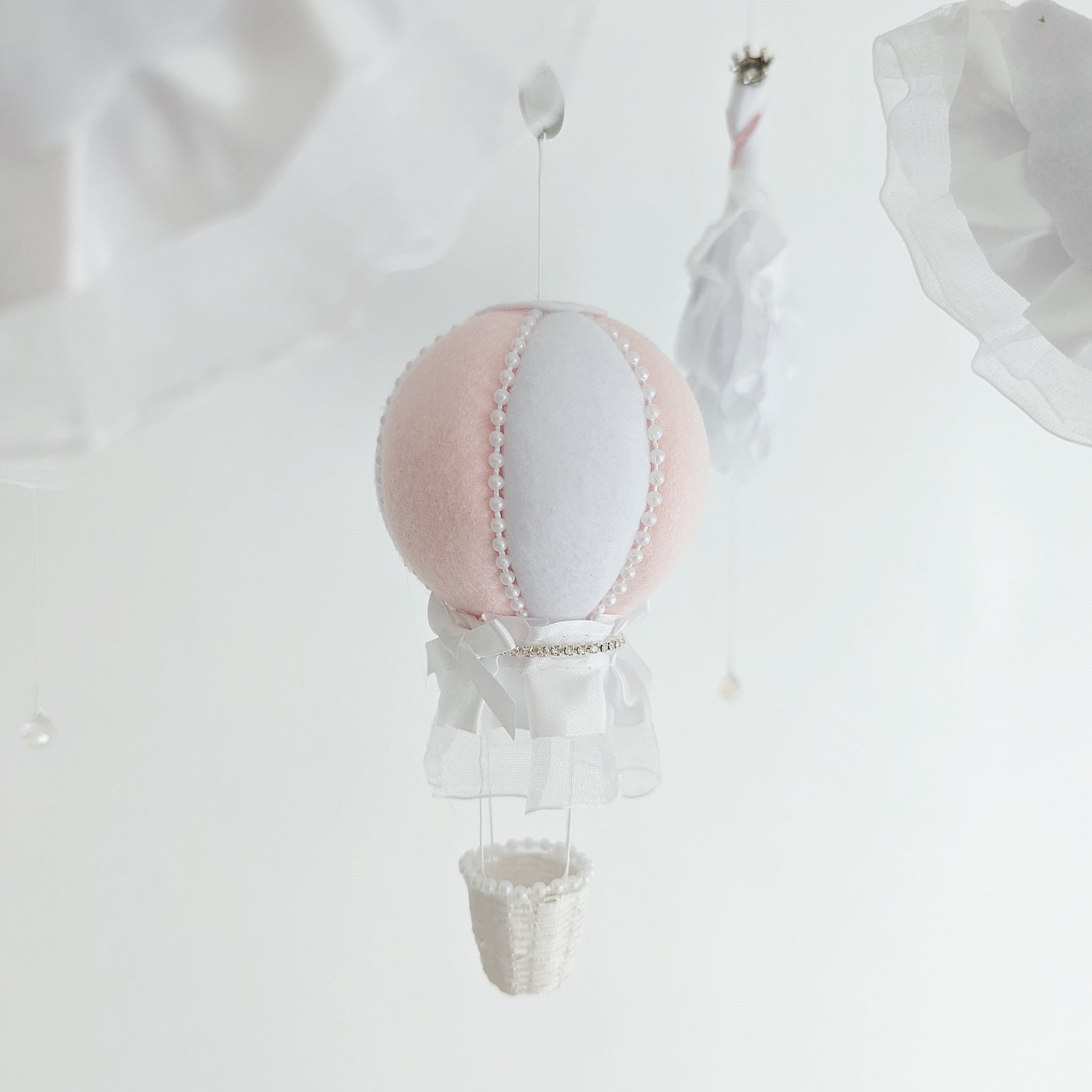 Features 4 ballet style swans and a soft blush hot air balloon
