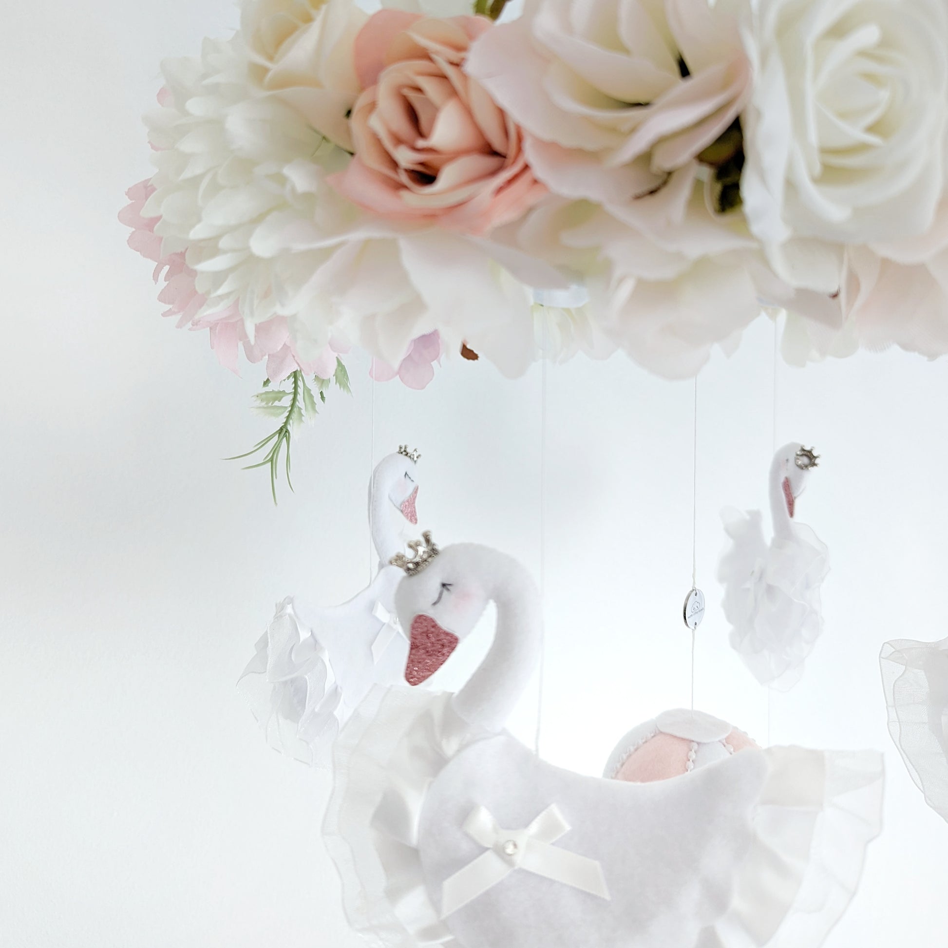 High above sleepy skies, a little ballet begins. Four graceful swans in their ruffled white tutus float in elegant formation, twirling beneath a crown of soft garden blooms. Between them, a gentle hot air balloon rises, pale blush and ivory, with satin bows and tiny pearls, like a dream in the morning light.